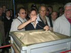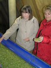 The processed hops come down . . . | . . . to where an open sack awaits. | On the way they are professionally appraised by Jeannette and Anny . . . | . . . while I just stand there looking decorative! |