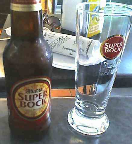 Beers Summary Find links to Portuguese breweries at the European Beer Guide Sagres 5.1% Basic lager style, more character than many similar, some malt flavours balancing the hop bitterness - a good refreshing drink Sagres Preta 4.3% Dark lager, less body than you'd expect from a dark beer, but some roasted malt taste to make it more interesting than the light. Sagres Bohemia 6.2% Red-brown body, sweetish, malt and caramel flavours, bitter finish Imperial Cerveja Viva 5.1% Basic lager, quite thin-bodied, some hop bitterness, adequately refreshing on a hot day but no real taste. Super Bock 5.6% Pale gold colour, dense white head, malt and hops in aroma, and malt taste with lingering bitterness. Super Bock Abadia 6.4% Nice amber colour, white head, aroma of sultanas which is also in the sweetish taste, although there is an underlying bitterness which lingers - the most interesting of the brews we met. It's interesting that Ron Pattinson's reviews