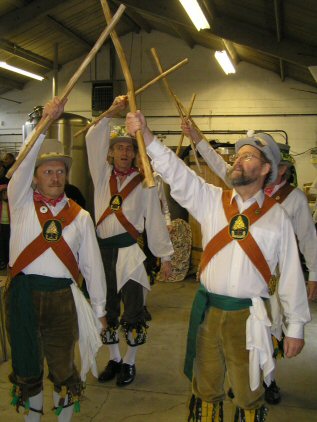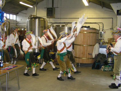 on camera! The first picture shows the clashing sticks, which should be enough to scare away the most determined evil spirits. In the second, the dancers are using kerchiefs to waft the blessed scent of malt to the faithful waiting outside the shrine. And if any foreign brewers wish to improve their beers with the benefit of this ritual, we're sure the Broadwood Morris would be only too pleased to oblige in exchange for their travellling expenses - and a few beers! |