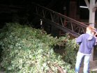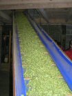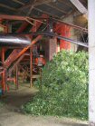 The bines are attached to the conveyor . . . | . . .which drags them into the machine . . | . . . which strips off the cones. They fall through to the moving belt below, and the waste is carried away. | |