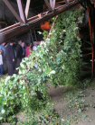Time for mechanisation! A tractor with a device to strip the bines from the poles, load them on the trailer, and take them back to the shed, and a machine Heath-Robinson would be proud of!. | |||